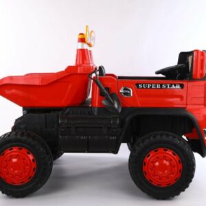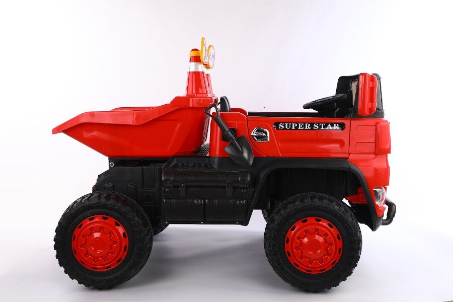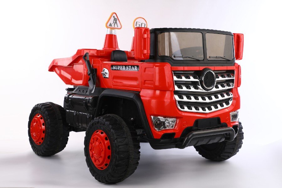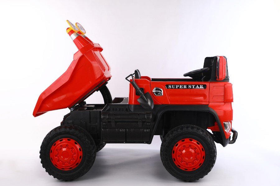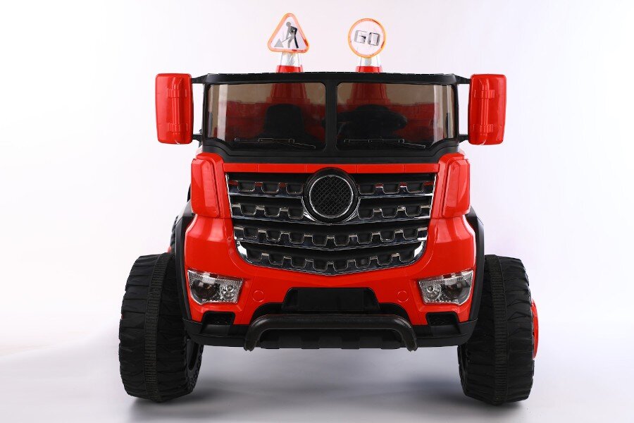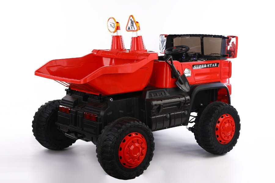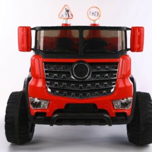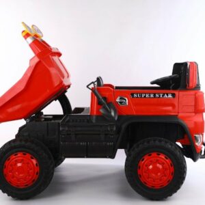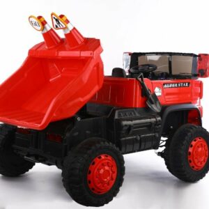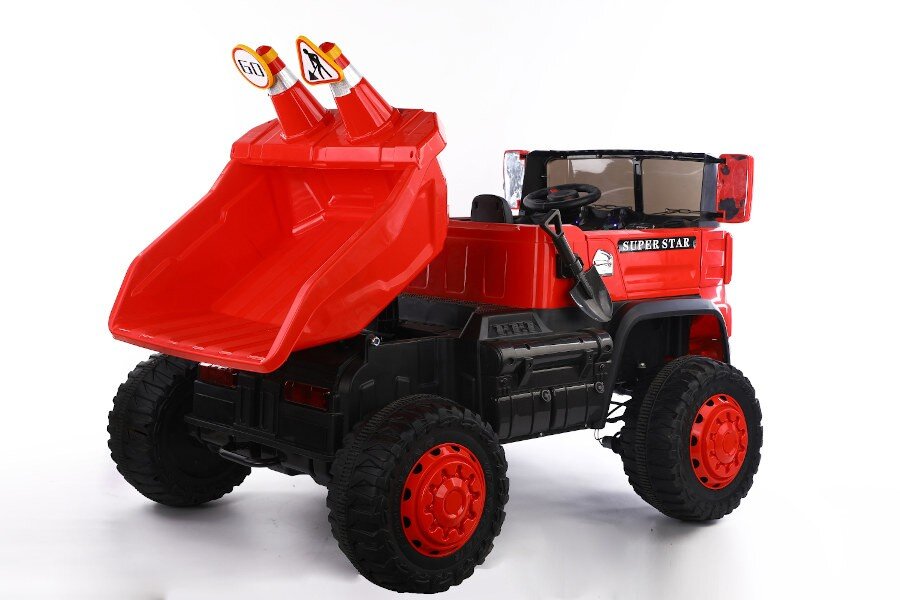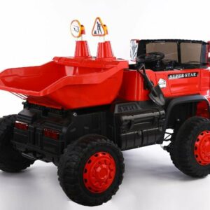 Wahlweise kann das Kind selbst mit Lenkrad bzw. Gaspedal oder die Erwachsenen können mit der 2,4Ghz 4 Wege – Fernsteuerung das Fahrzeug kontrollieren. Es ist ein MP3 Anschluss eingebaut und Sound kann reguliert werden. Dank 4 x 12V Elektro Motoren hat er genug Kraft um zwei Kinder mit bis zu 40 kg tragen zu können. Es sind Scheinwerfer eingebaut. Mulden ist Elektronisch kippbar.